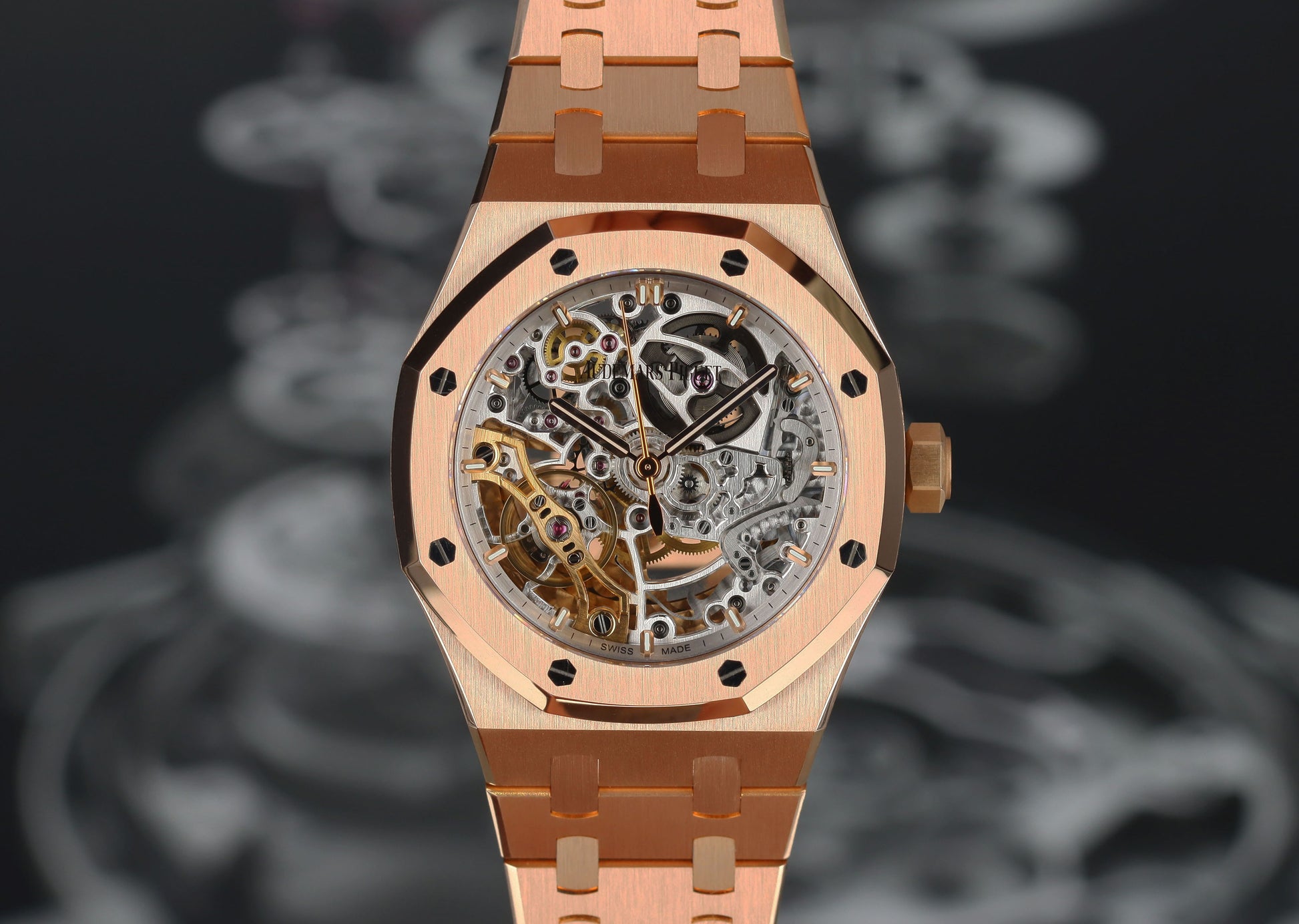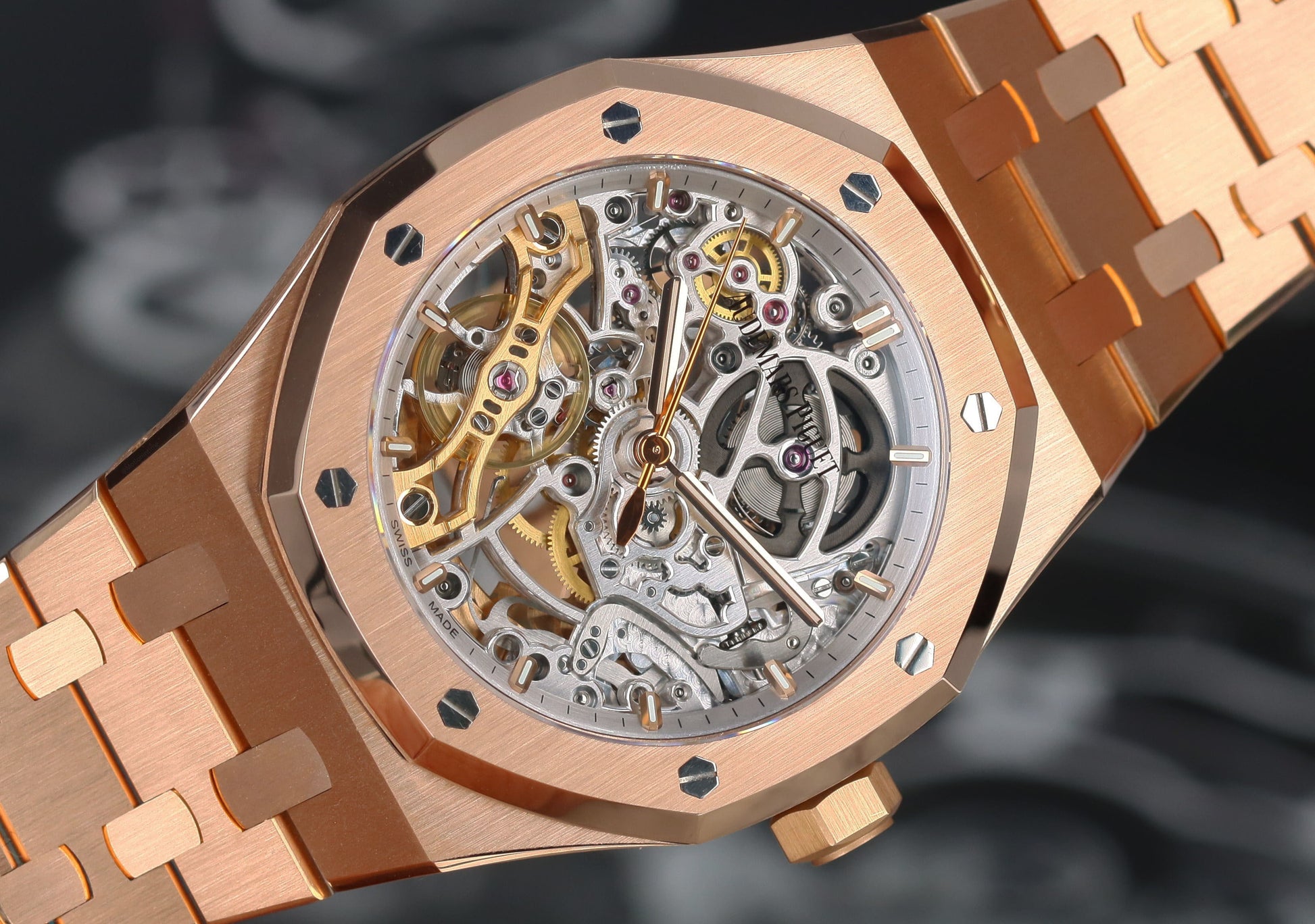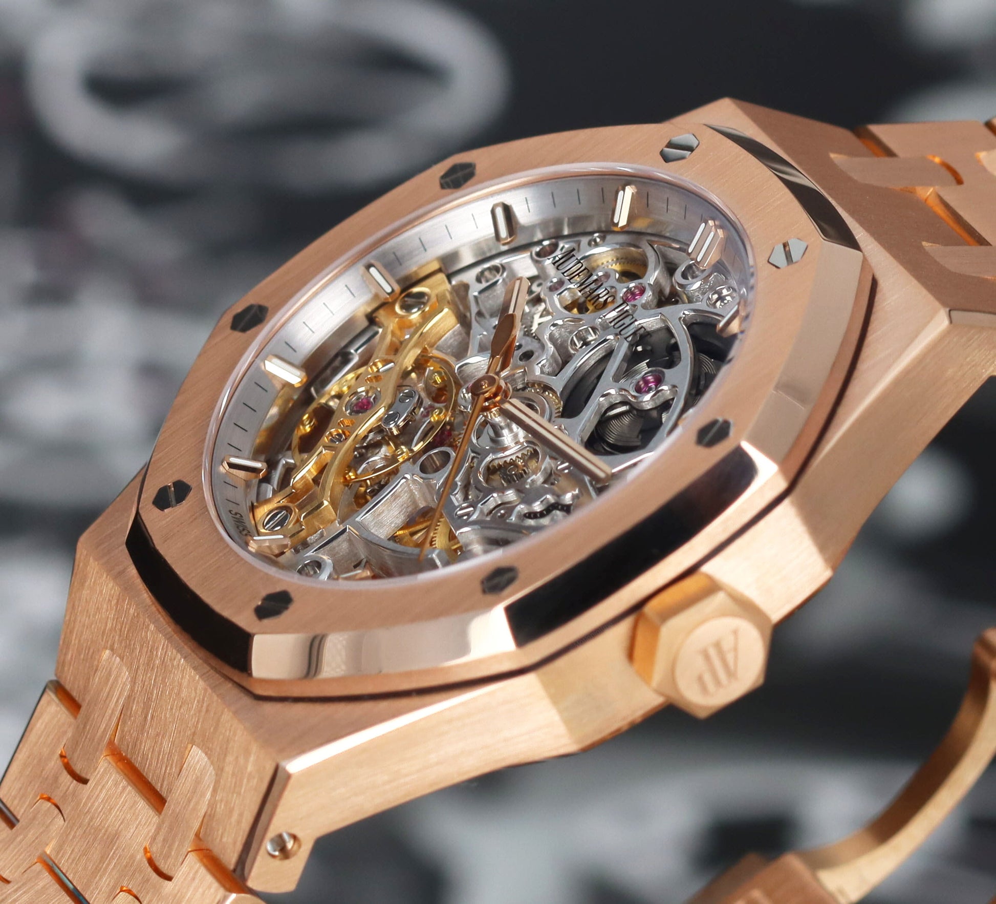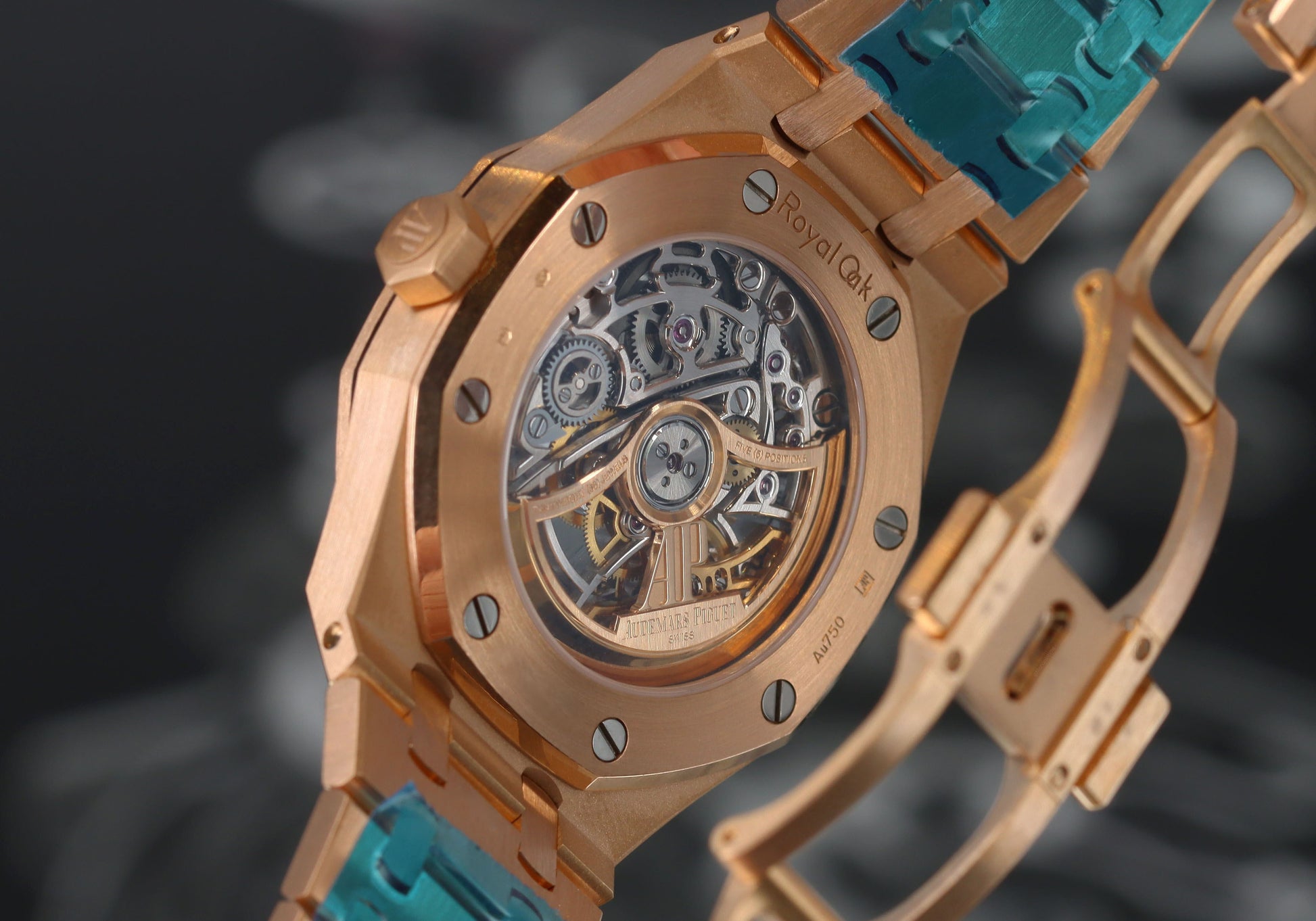 The sapphire caseback further enhances the openworked experience, showcasing the exquisite hand-finishing techniques that Audemars Piguet is known for, beveled edges, polished surfaces, and intricate decoration throughout.