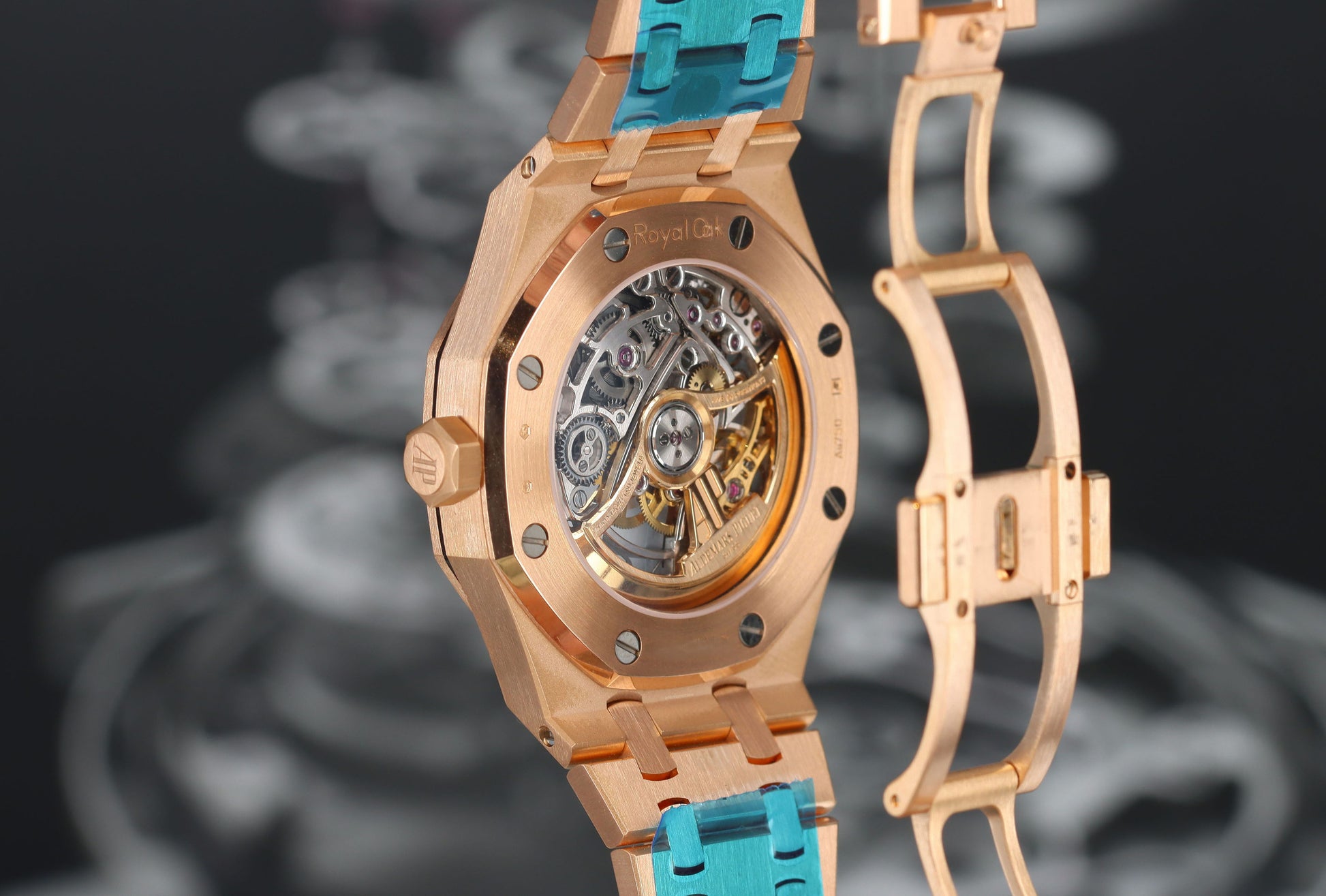 Completing the timepiece is the integrated 18k rose gold bracelet, executed with the Royal Oak’s signature alternating brushed and polished links, delivering both comfort and a seamless extension of the case.