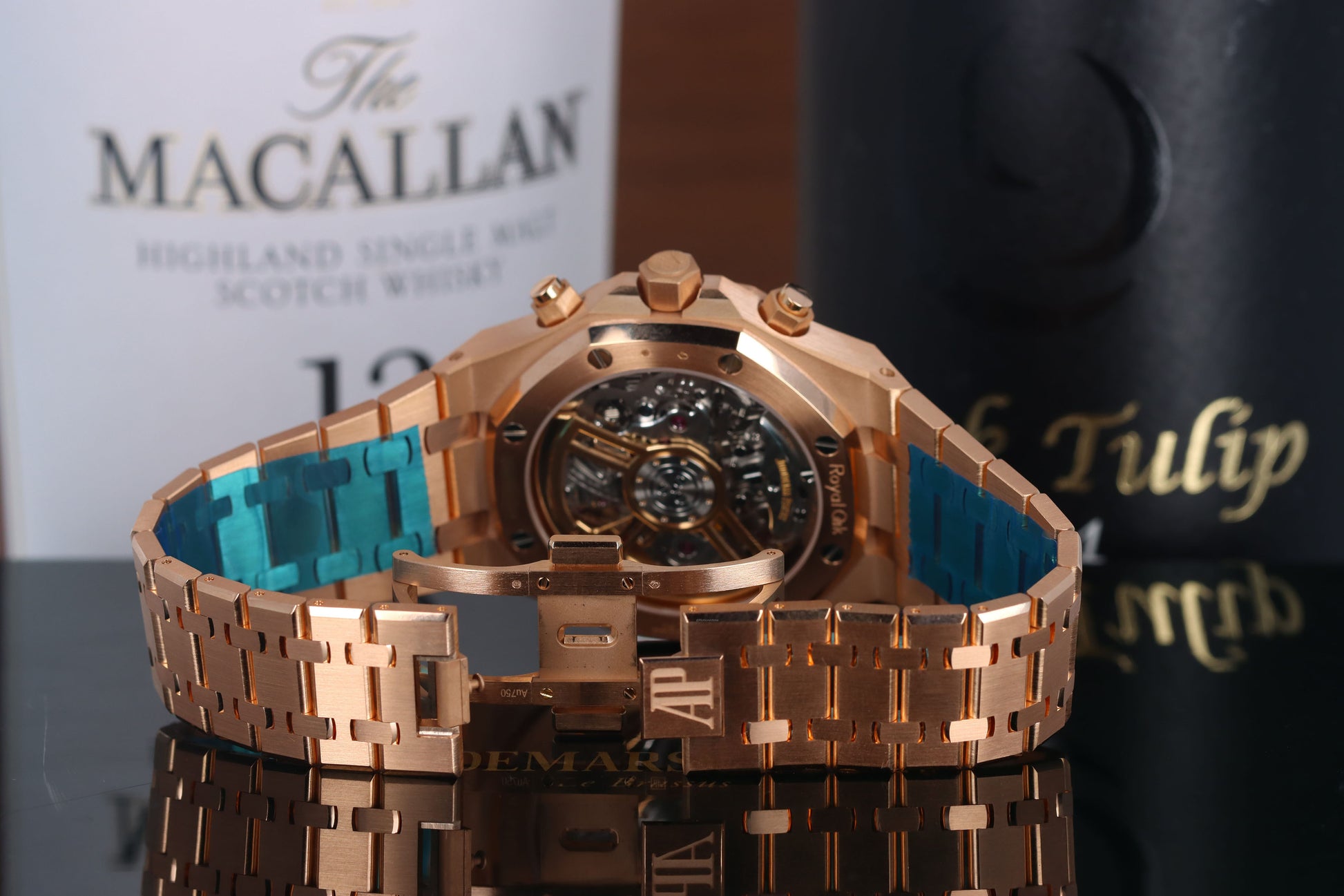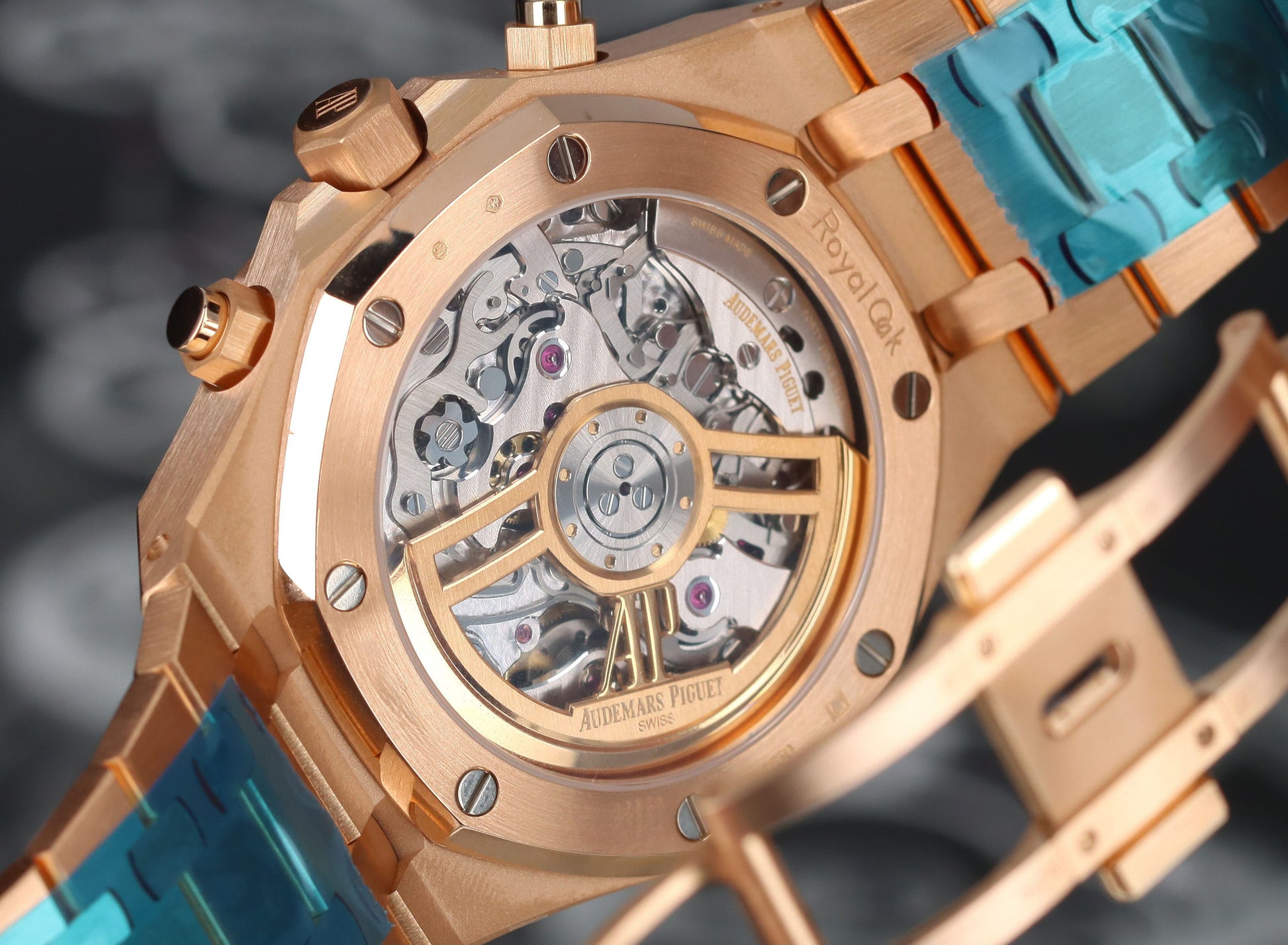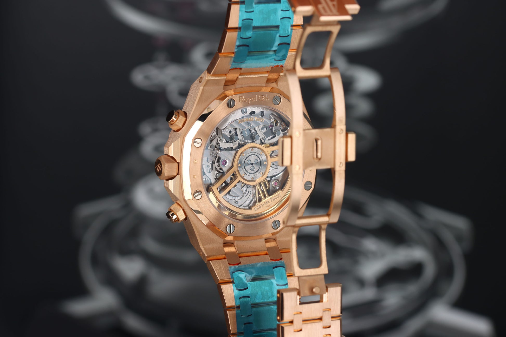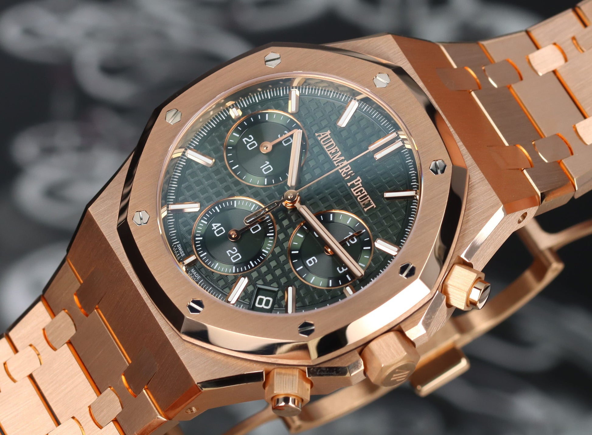 Crafted in 18k rose gold, the case measures 41mm in diameter and carries the unmistakable brushed and polished finishing that Audemars Piguet is revered for. The octagonal bezel, secured by eight polished hexagonal screws, frames a richly textured green “Grande Tapisserie” dial, a signature of the Royal Oak collection. The dial is enhanced with applied rose gold hour markers, luminescent-coated hands, and three chronograph sub-dials providing balanced functionality and visual depth.