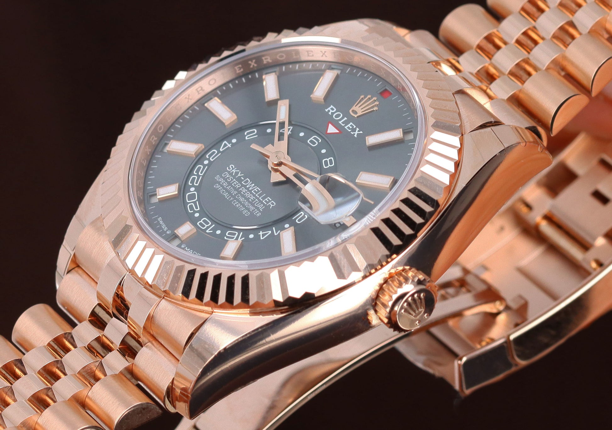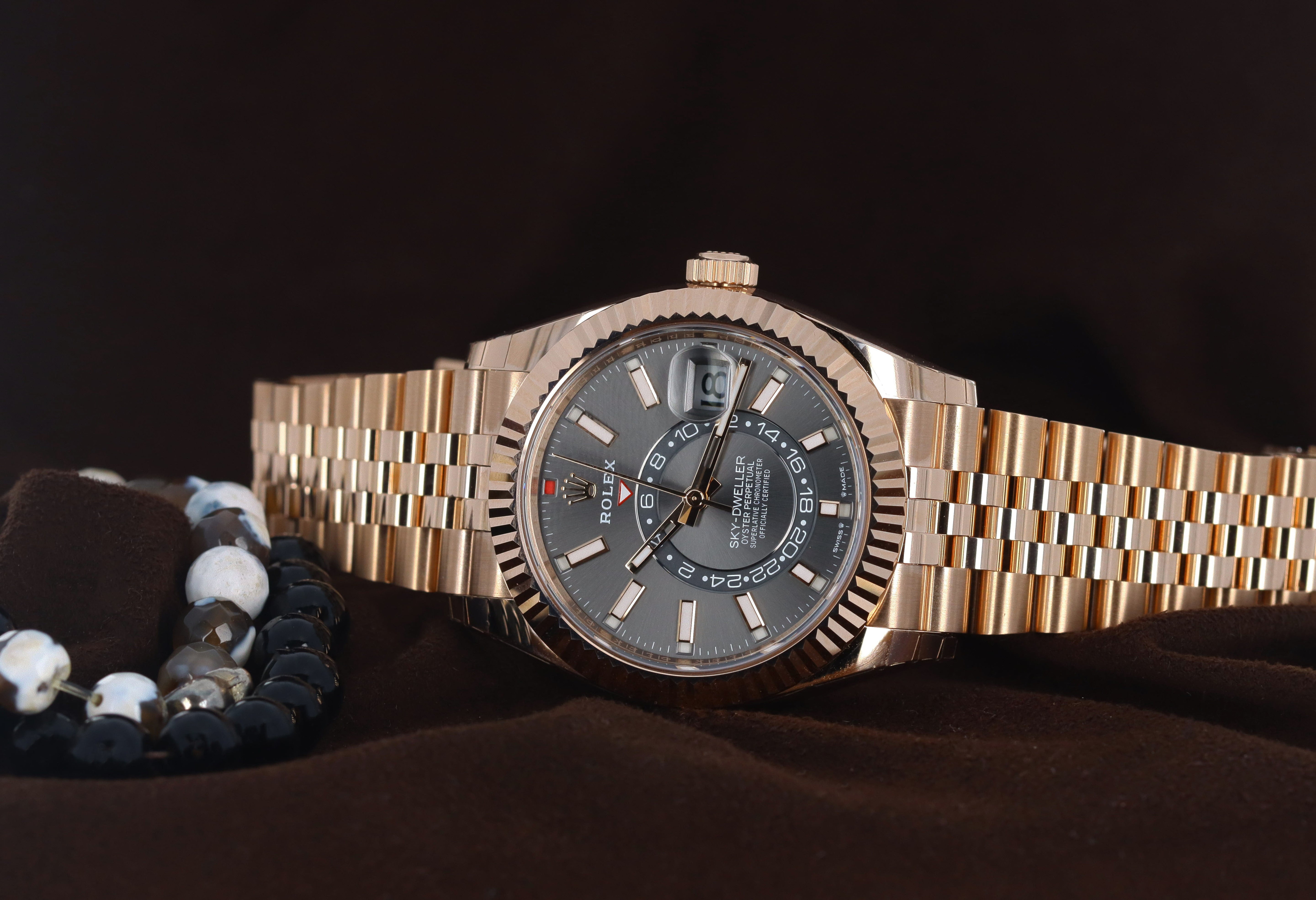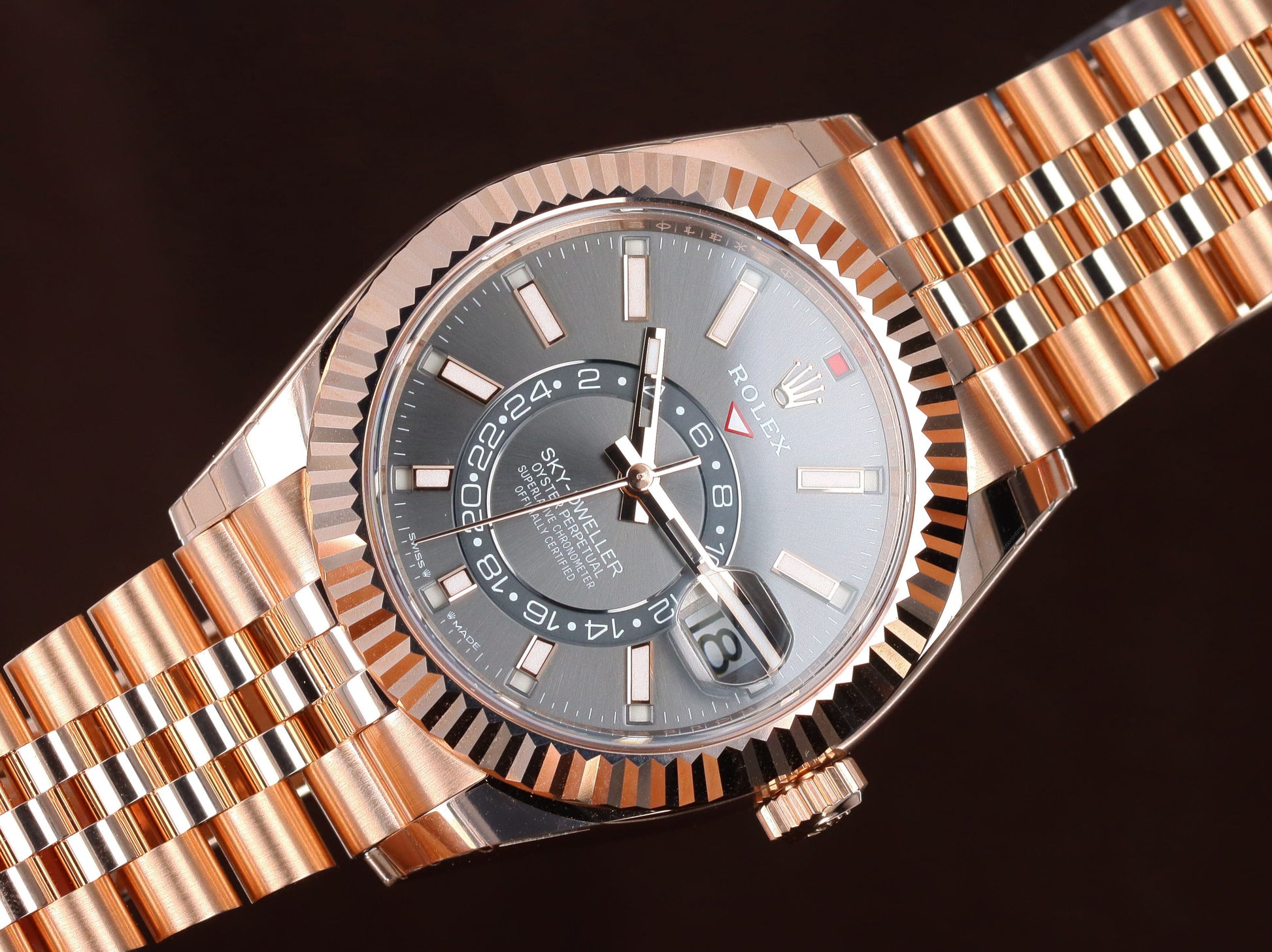 - Rolex Sky-Dweller 'Annual Calendar Dual Time Zone', Grey Sundust Dial, Fluted Bezel - 18kt Rose Gold on Jubilee Bracelet